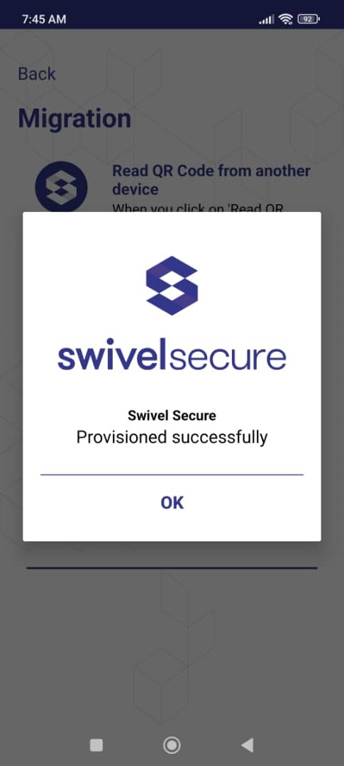 Step 11: The app performs its internal migration process and presents the dialog box that the AuthControl Mobile Authenticator (AMA) app has been provisioned correctly, or if there was any error in the process, it indicates that the app was not provisioned (see figure 13).