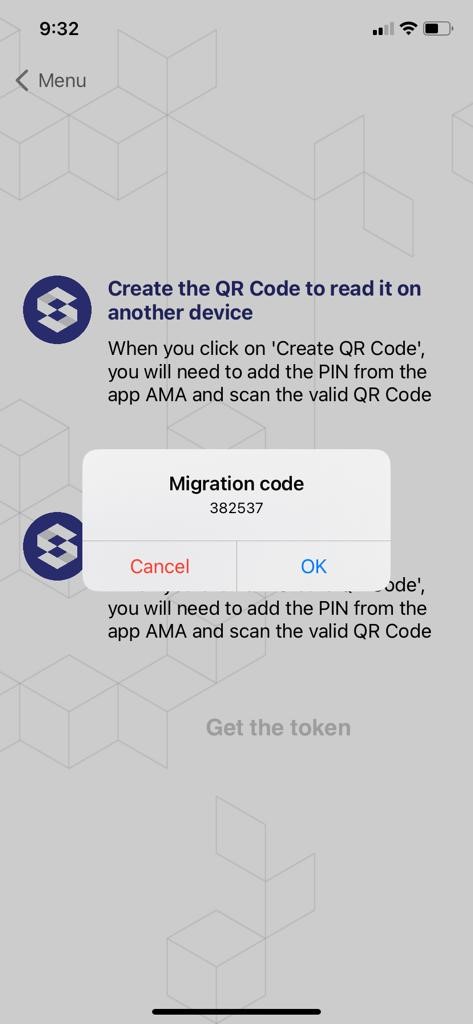 Step 6: Press the “Get the token” option. Once you have clicked on the “Get the token” option, a dialog window is displayed with the Migration Code and two options: “Cancel” and “Ok”. Memorize (write down) the Code, click the “OK” option, minimize the app and enter the AuthControl Mobile V5 app (see figure 21).